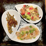 前菜盛り(豆アジのバルサミコマリネ・牛たんコールスローサラダ・ビンチョウマグロのたたき)