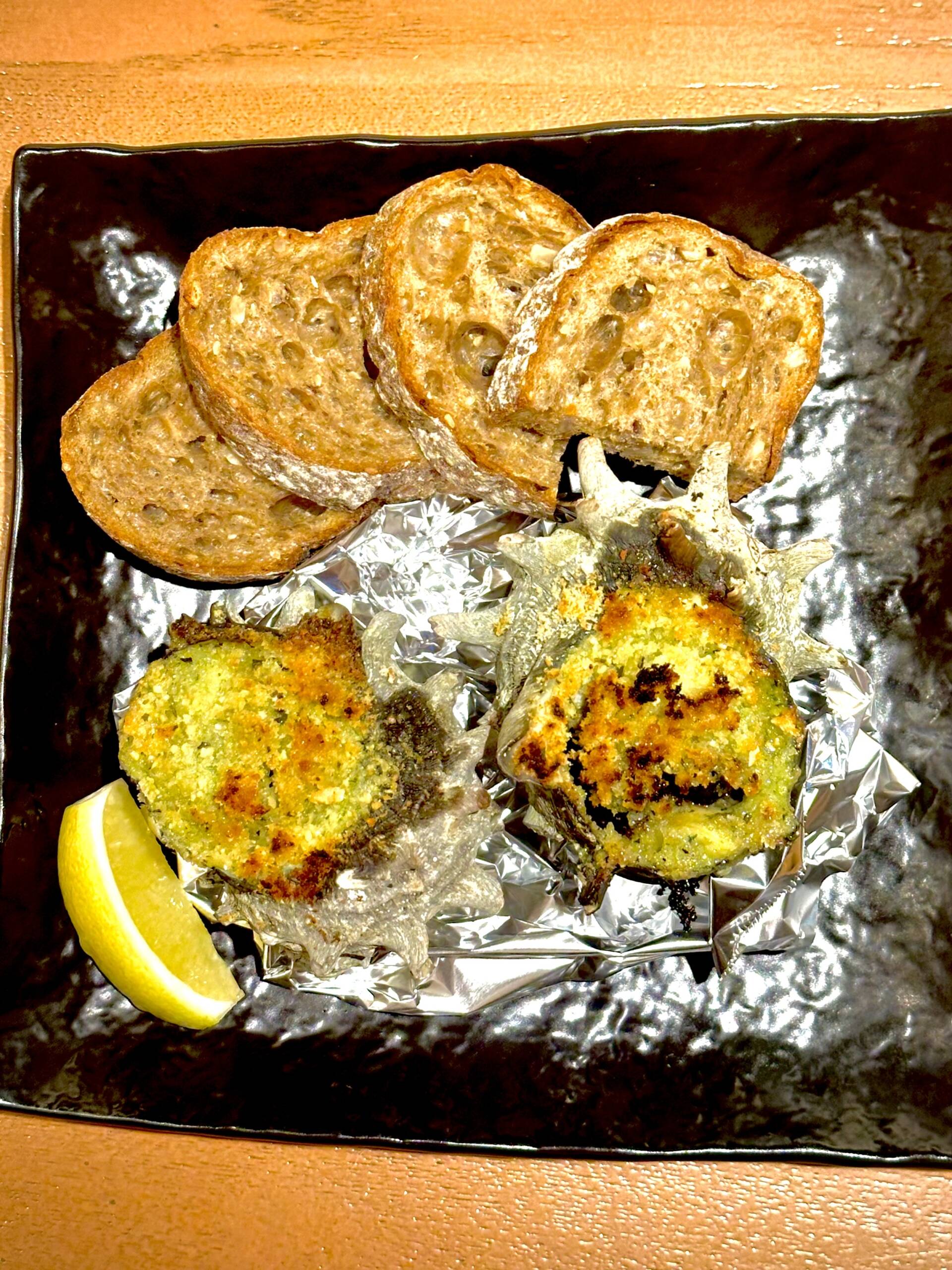 ¥1,320天聖にんにくとカキとしし唐辛子のアヒージョ
